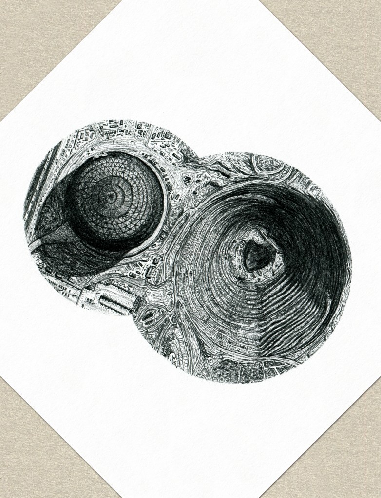 « La Sphère » (série « En Approche »), graphite sur papier, 20 x 20 cm en carré sur pointe, 2023