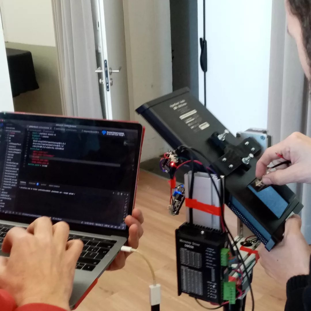 Nous avons rencontré Bertrand Wolff au G.M.E.M. où il est actuellement en résidence avec Guillaume Stagnaro, qui l’accompagne sur la conception de pieds motorisés visant à faire entrer les enceintes en mouvement. Habituellement utilisés de manière statique dans certains lieux publics pour diffuser des messages à l’attention des visiteurs, ces haut-parleurs directionnels vont ici générer des réverbérations variables en fonction de la surface vers laquelle ils seront tournés. D’où l’importance de déterminer en amont quels types de fonds résonnent le mieux, objectif de cette première phase de création. Au milieu des machines, des diodes et des câbles, nous avons eu la chance d’en apprendre davantage sur le travail de Bertrand et de découvrir cette sensation surprenante d’ « entendre l’espace ».
