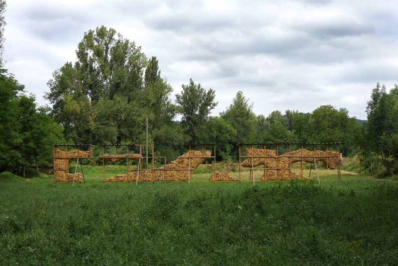Sculpture, wood, concrete, wire mesh, corn, 2300 x 350 x 60 cm, 2017